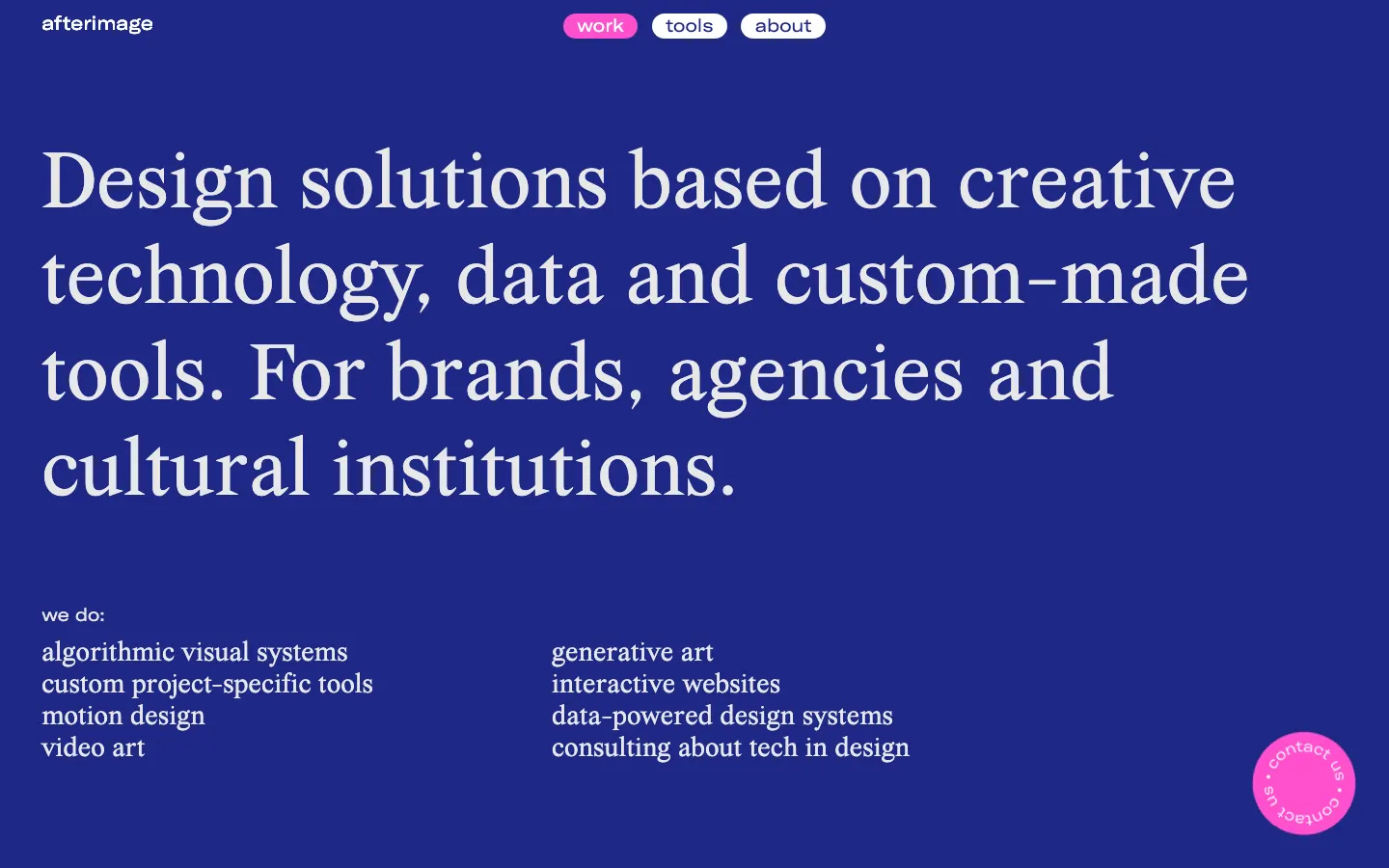 Afterimage showcases design tools and creative projects including typography animations, video editing tools like MovingLayers, and visual identity projects such as Cumulus, aimed at designers and creative professionals seeking inspiration and software solutions.