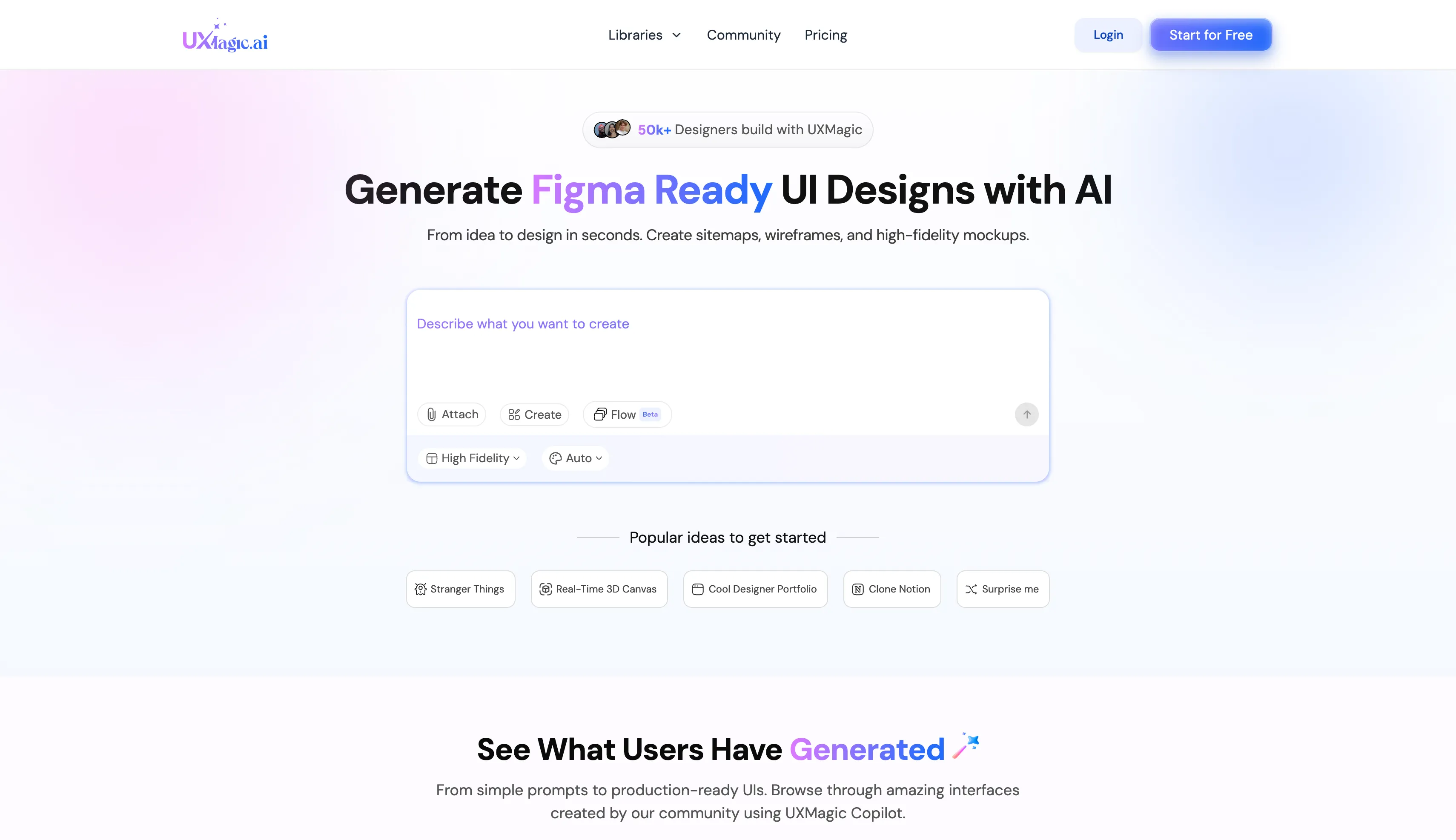 Turn any idea into pixel-perfect, Figma-ready UI designs - text, screenshots, or references. Trusted by 50,000+ designers. Try free.