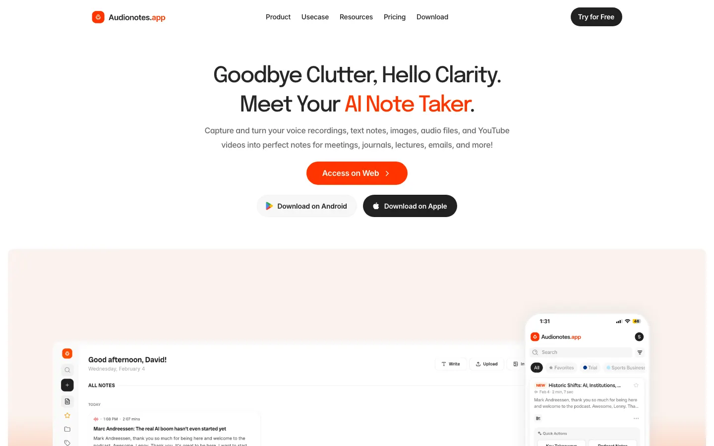 Turn voice, text, images & video into organized AI notes. Transcribe meetings, lectures & journals in 80+ languages. Rated 4.9+ by 200K+ users. Try Audionotes free.