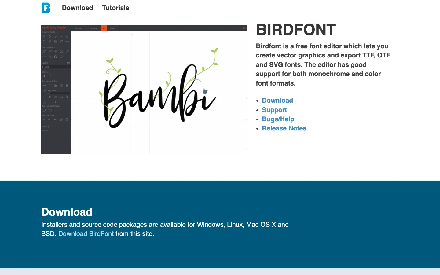 Birdfont is a free font editor that allows users to create vector graphics and export TTF, OTF, and SVG fonts, supporting both monochrome and color formats. It's available for Windows, Linux, Mac OS X, and BSD, and is useful for designers and developers who need to create custom fonts. The site offers downloads, donation options, and showcases fonts made with Birdfont.