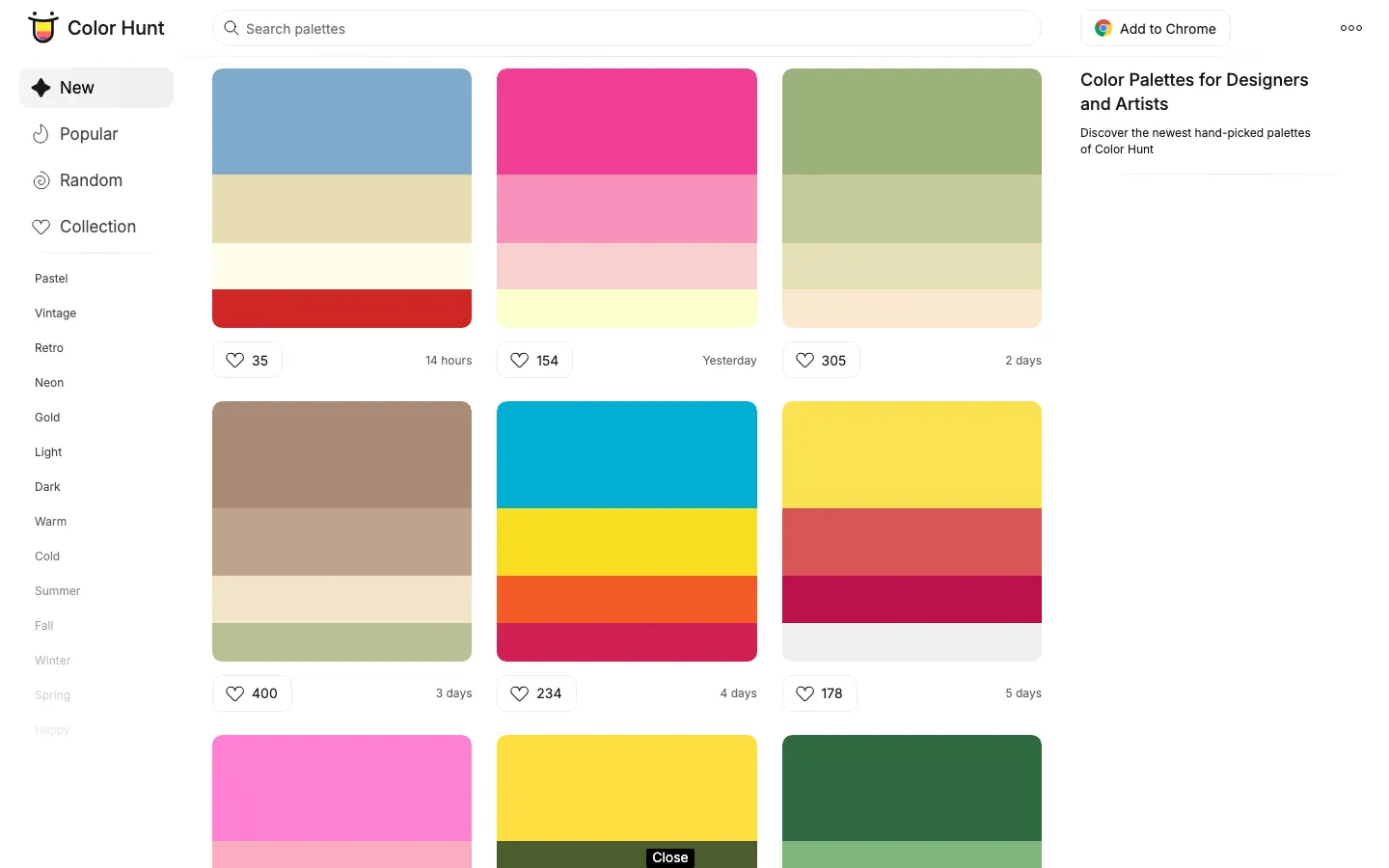 Discover the newest hand-picked color palettes of Color Hunt. Get color inspiration for your design and art projects.