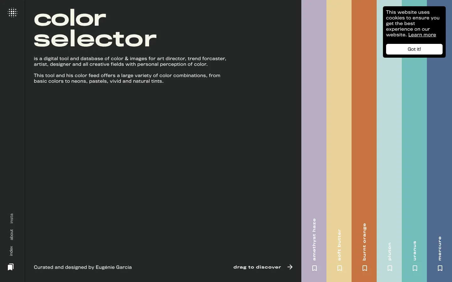 Color Selector is a database of color & images for artists, designers, photographers, printers or curious people and my personal perception of color. This tool offers a large variety of color combinations, from basic colors to neons, pastels, vivid and natural tints.