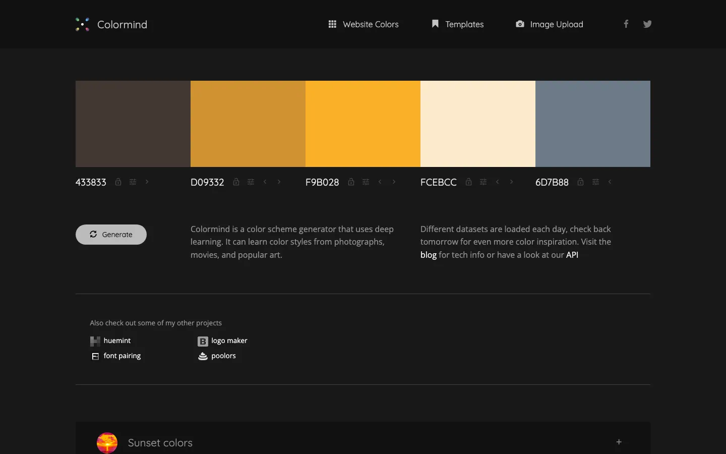 Generate color combinations in one click. Colormind creates cohesive color schemes using a deep neural net.