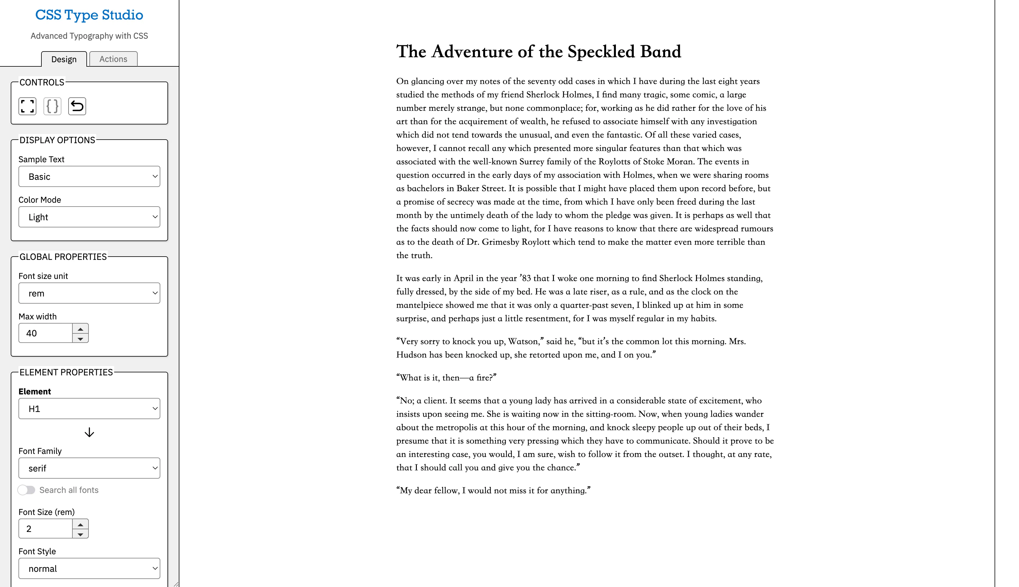 Create layouts in HTML that are pleasurable to read. CSS Type Studio lets you quickly iterate through different typefaces, sizes, spacing attributes, and more.