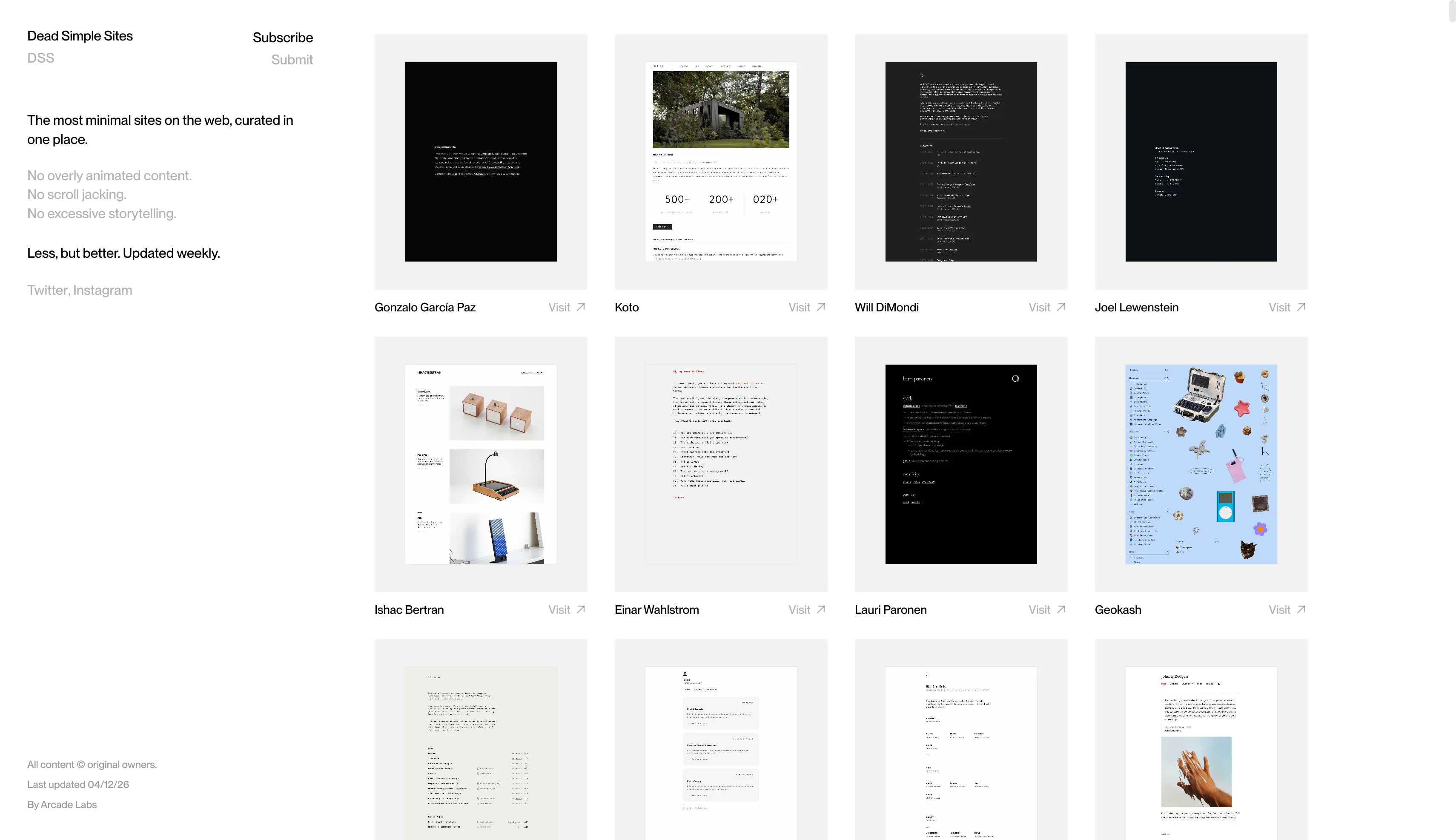 A curated gallery of the most minimal, clean websites on the internet. No animations, no scroll jacking — just pure, simple web design inspiration. Updated weekly.
