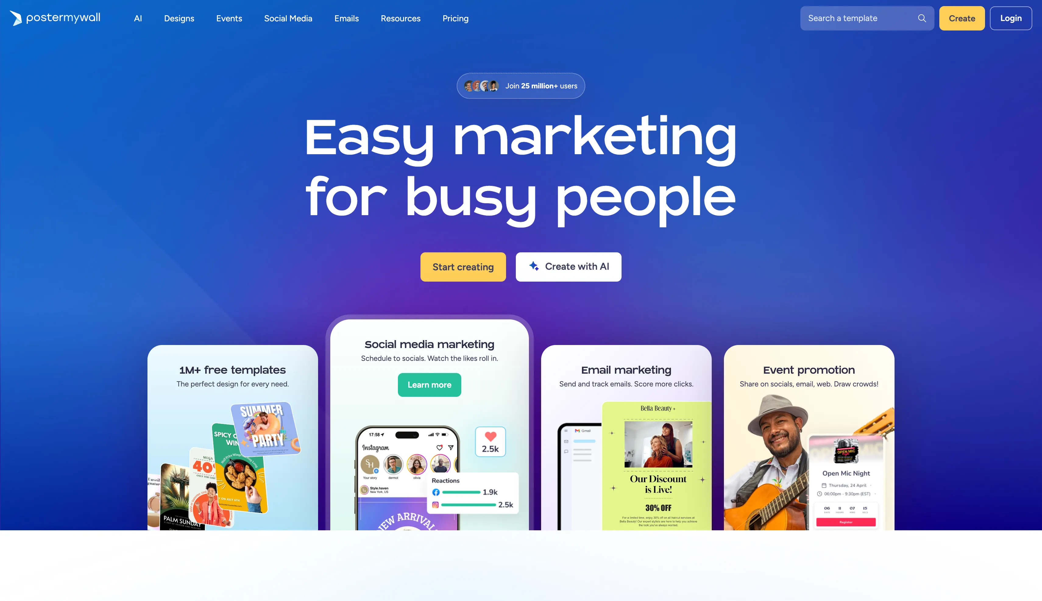 Win at marketing with PosterMyWall’s time-saving AI tools. Create free designs, share event pages, and publish to socials and email—all on one easy-to-use platform.