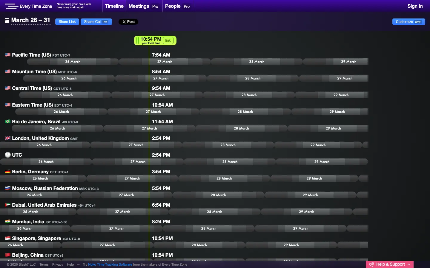 Easily find the exact time difference with the visual Time Zone Converter. Find meeting times for your contacts, locations and places around the world. Never warp your brain with time zone math again.