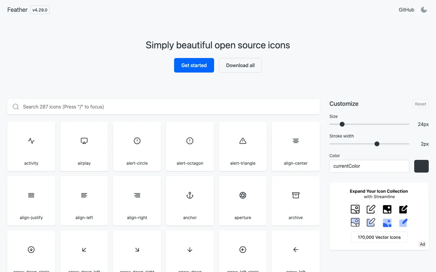 Feather is a collection of simply beautiful open source icons. Each icon is designed on a 24x24 grid with an emphasis on simplicity, consistency and readability.