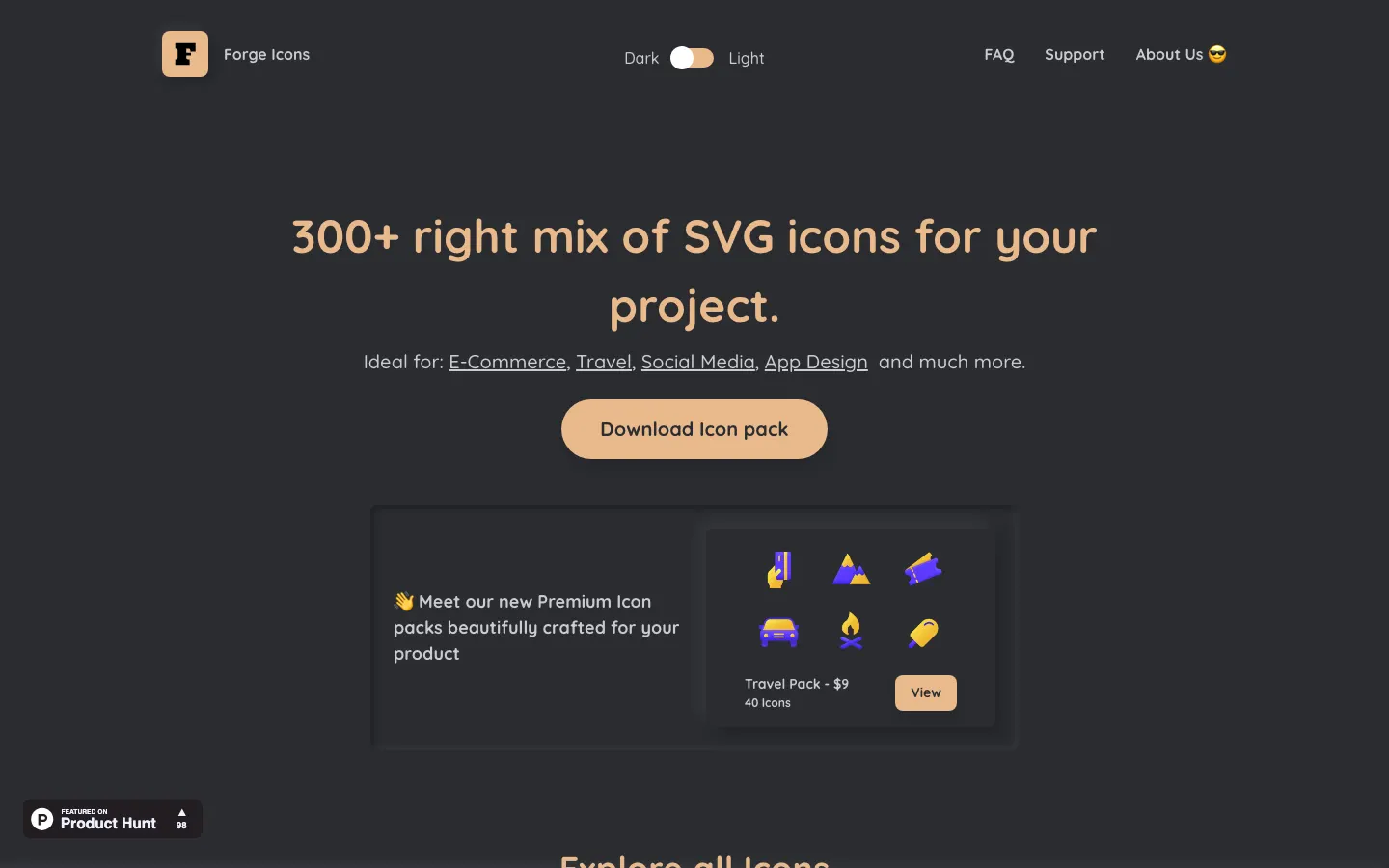 Forge Icons - 300 right mix of SVG icons for use in e-commerce, travel, social media, app design and much more.