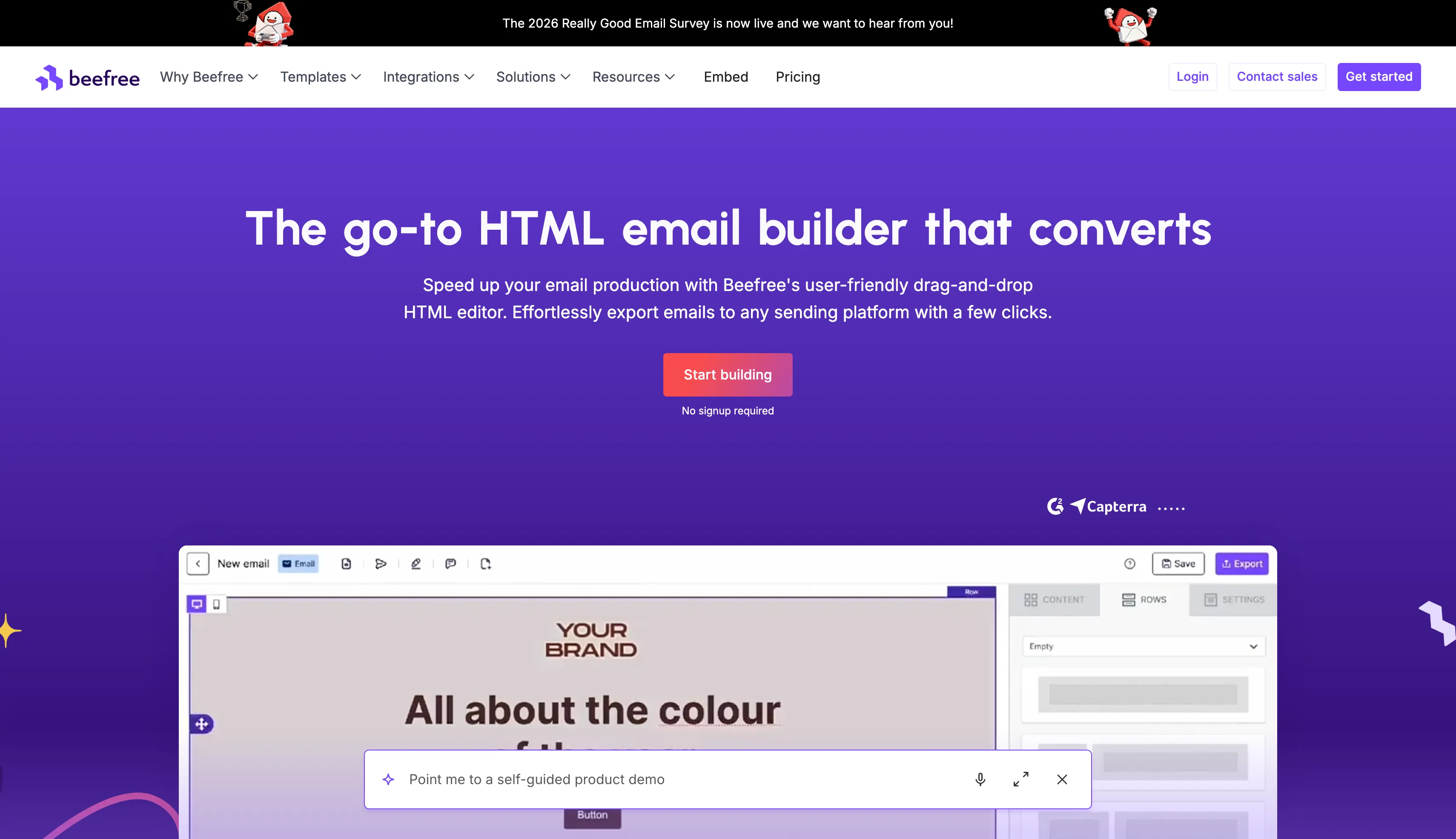 Speed up email creation with Beefree's drag-and-drop, no-code HTML email builder and editor. Compatible with your favorite sending platform. Sign up for free!