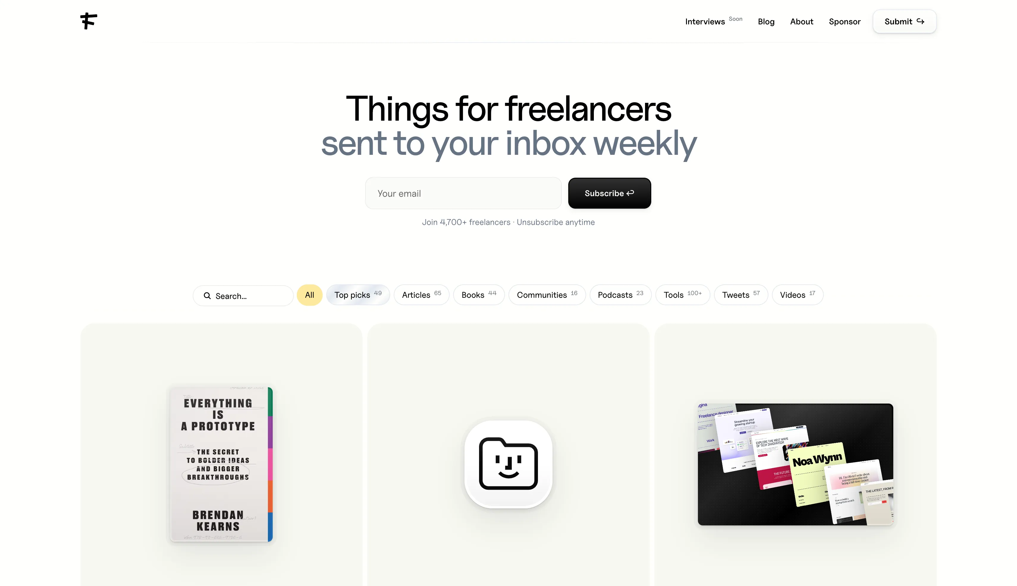Discover the best communities, tools, articles, books, podcasts, and videos to help you on your freelance journey. Sent straight to your inbox, updated weekly.
