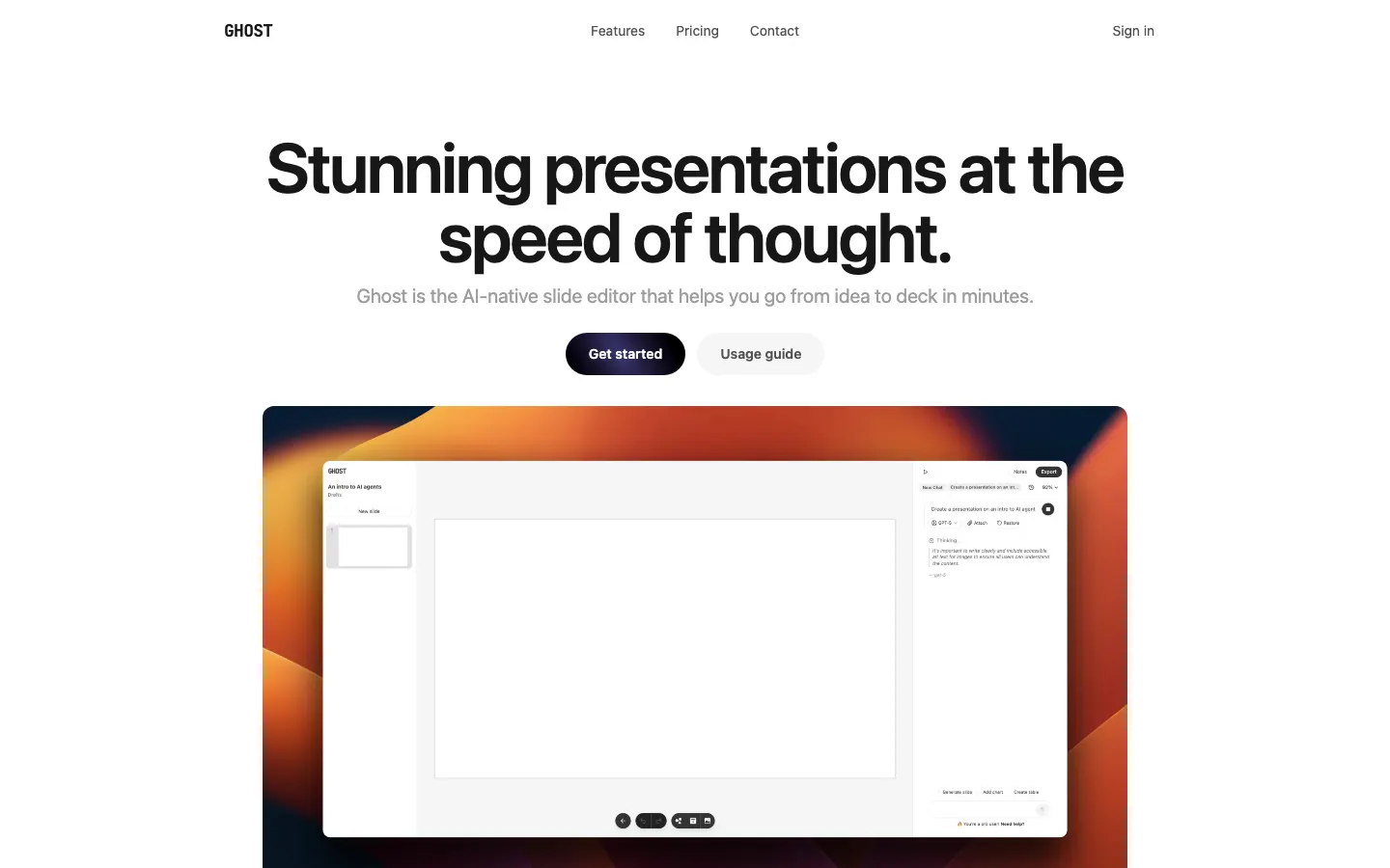 Ghost is an AI-native presentation editor. Design, redesign, and export slides instantly with GPU-accelerated editing and simple controls.