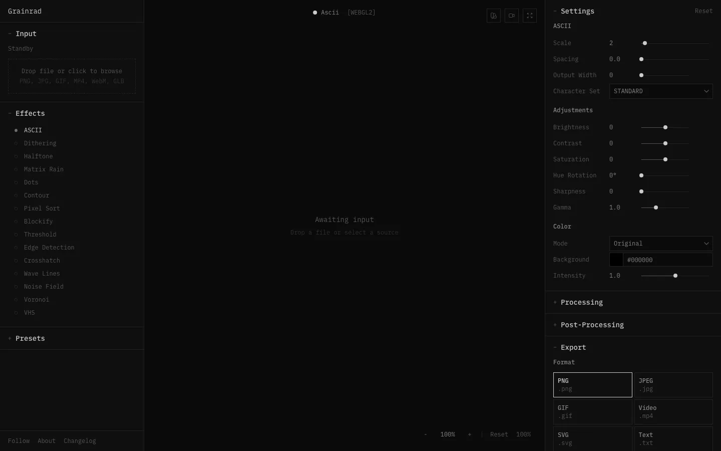 Grainrad - Free WebGPU-powered ASCII, dithering, and retro effects at 60fps