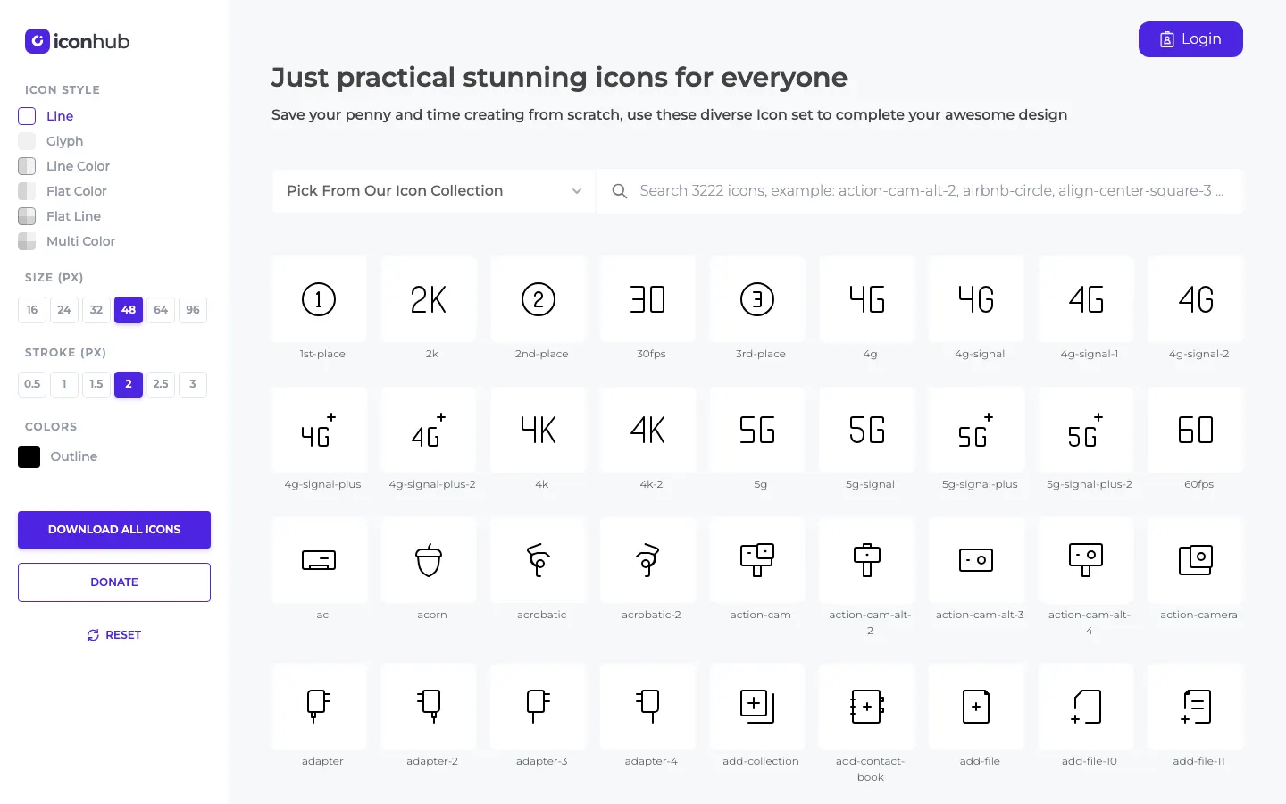 Iconhub is a platform offering practical stunning icons for users who need to download them, requiring a free login or registration. The site encourages sharing on social media and accepts donations via PayPal to support its work.