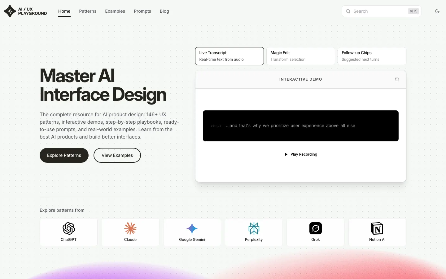 Learn AI Design with 141+ production-ready AI UX design patterns and best practices. Discover interactive demos and examples from ChatGPT, Claude, Perplexity, and other leading AI products. Master AI interface design, AI UX patterns, and AI design systems.