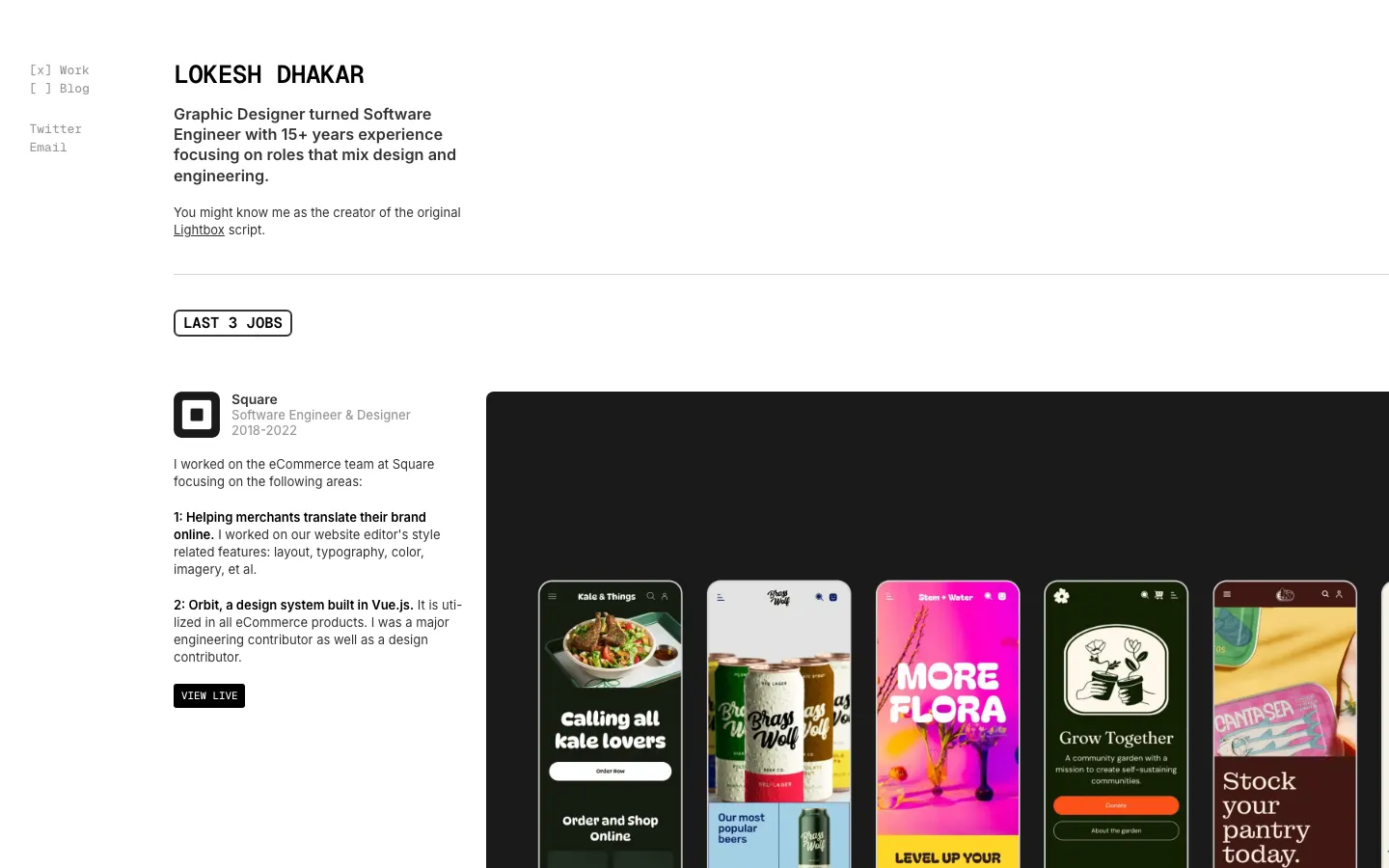 Lokesh Dhakar's portfolio showcases his work as a design engineer at Square and Getaround, where he contributed to website editors and design systems. He's known for creating popular open-source projects like Lightbox, Color Thief, and Color Stacks, which provide tools for image overlays, color extraction, and palette generation. The site also features browser-based games like Bitsweeper and Team Bee, demonstrating his diverse skills in web development and design.