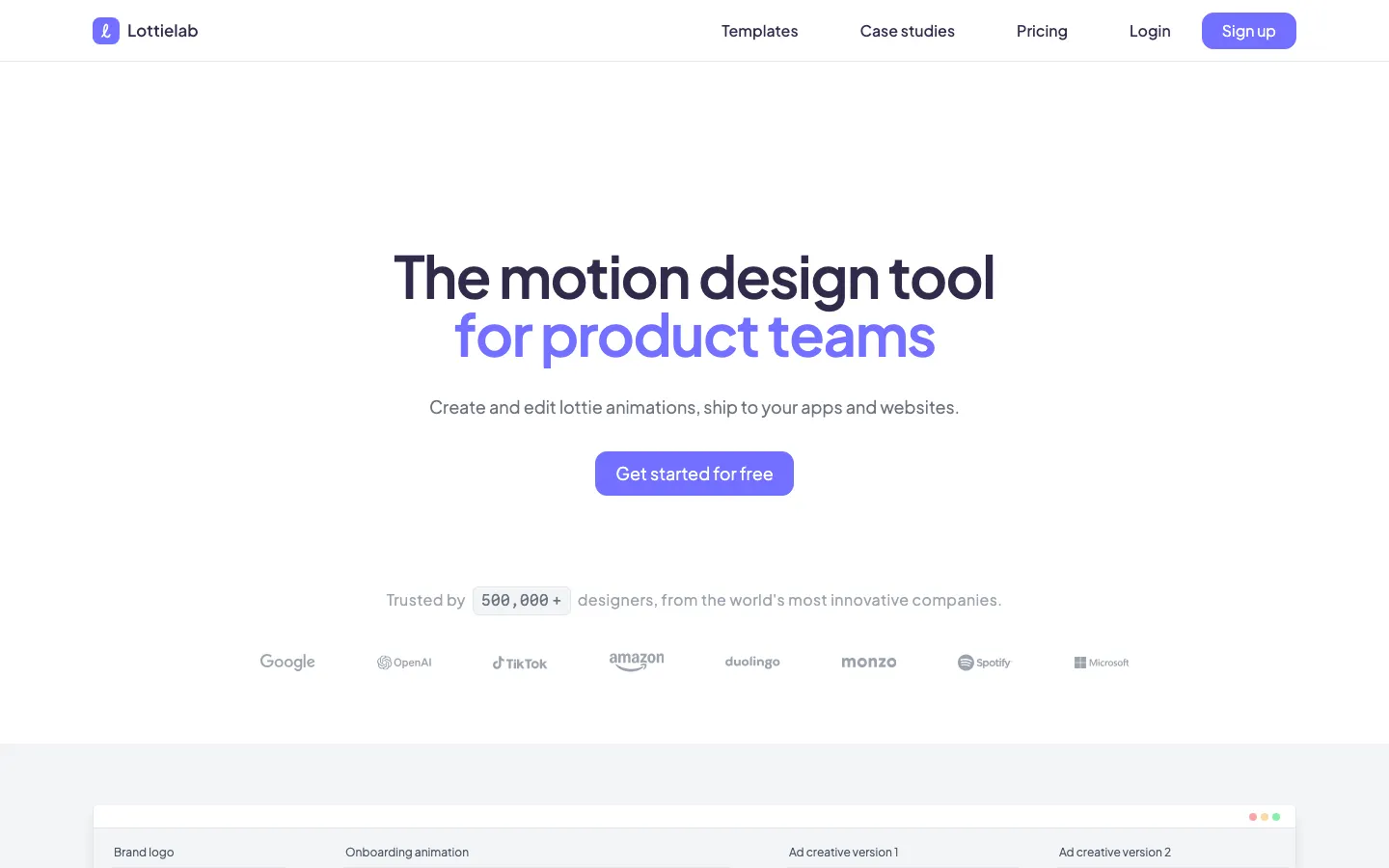 Create and ship animations to your products faster. Bring your websites and apps to life with the simplest editor for Lottie animations.