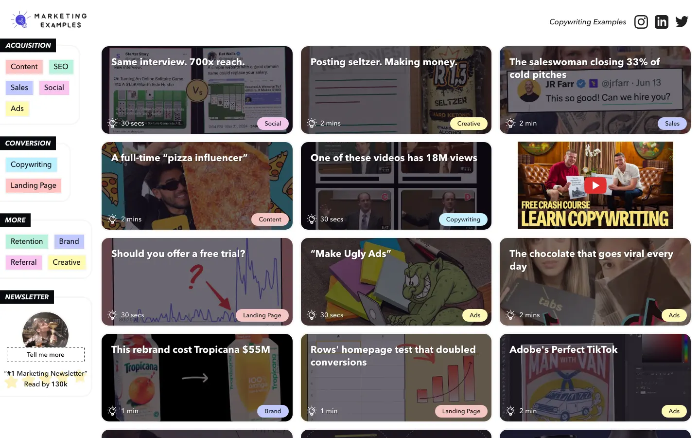 A gallery of real world marketing examples from successful companies. Want to perfect your cold email, boost referrals or improve SEO? Browse the case studies or filter by category. See something you like. And get inspired. It's like Dribbble, but for marketers.