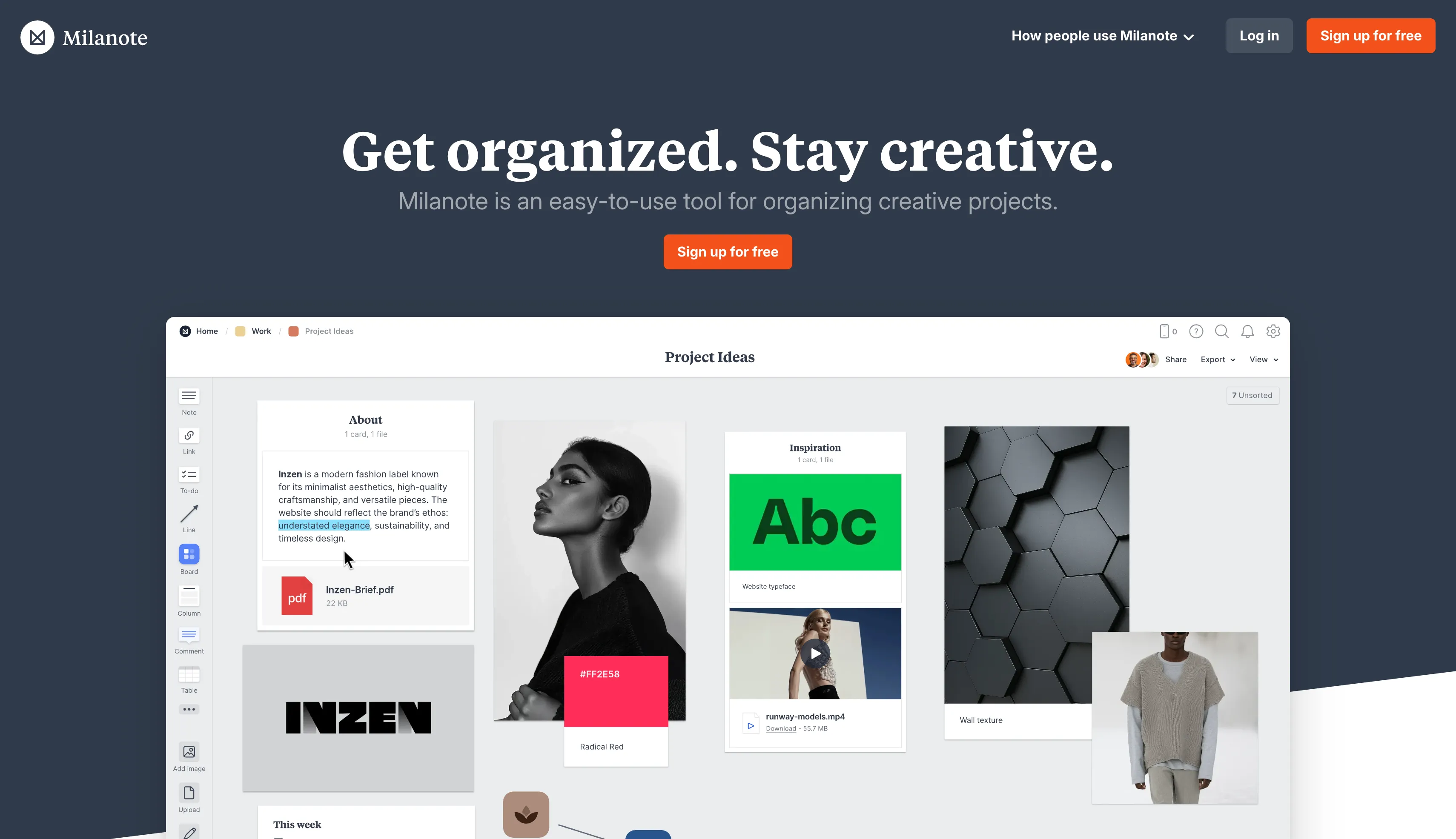 Milanote is an easy-to-use tool to organize your ideas and projects into visual boards. Add notes, images, links and files, organize them visually and share them with your team.