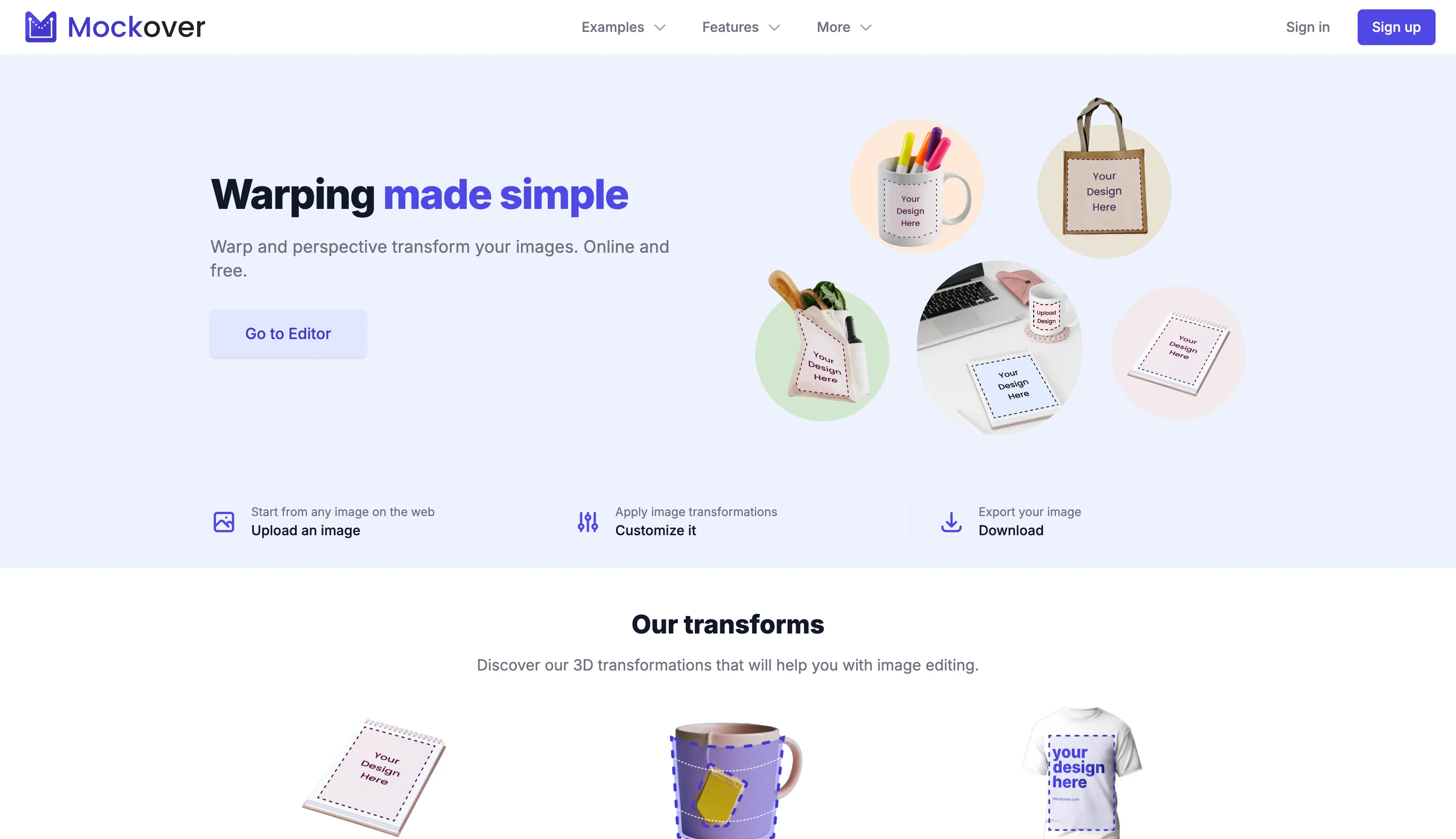 Mockover is an image editor packed with 3D transformations. Warp any photo, apply perspective transform and post-process your images online.