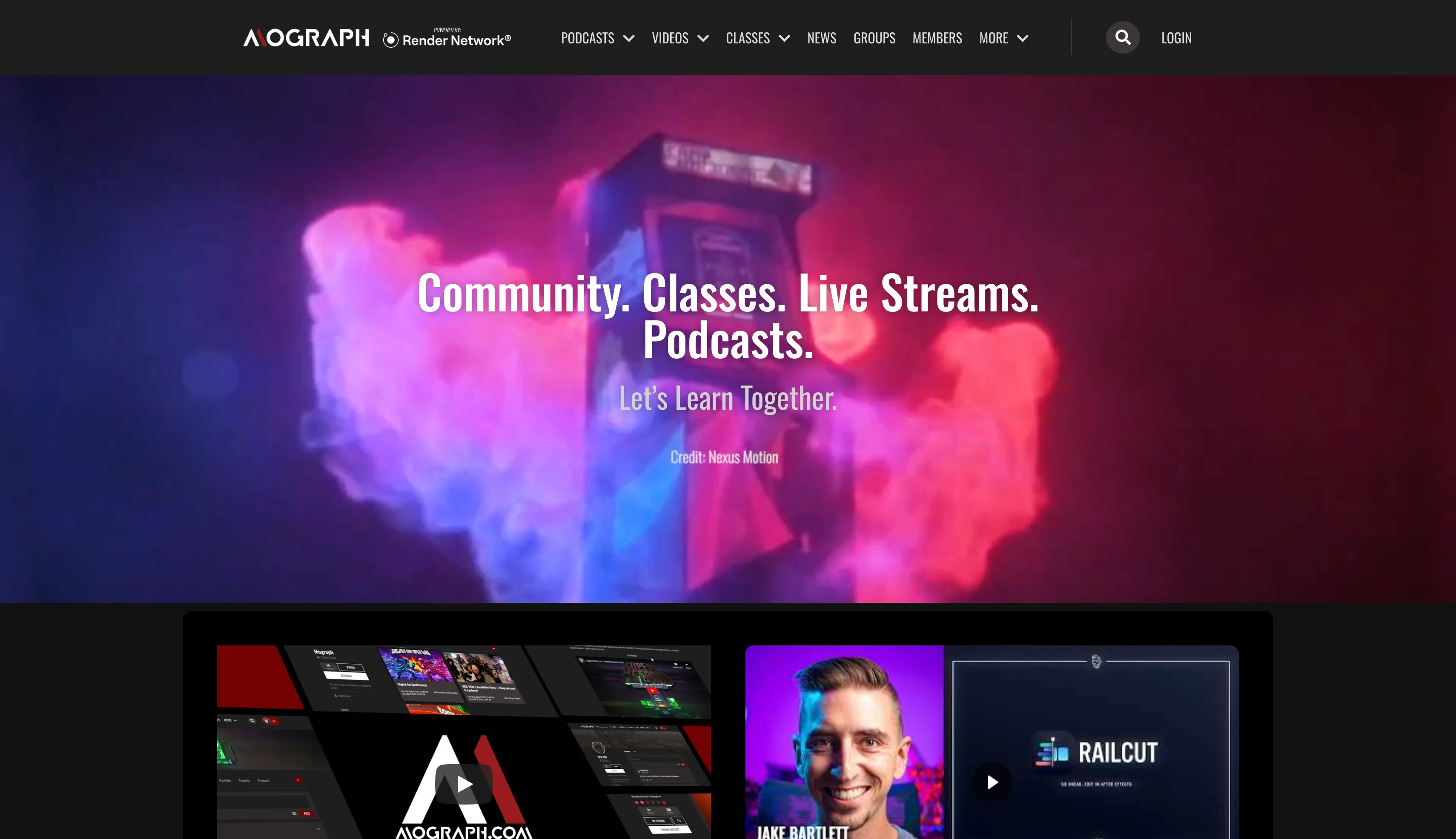 Mograph offers a community platform for motion graphics artists featuring podcasts, live streams, classes, and learning resources. The site hosts regular live episodes with industry guests, providing educational content and insights for motion graphics professionals and enthusiasts.
