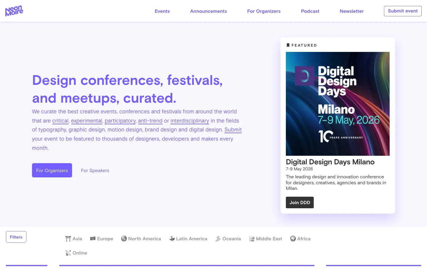The best design events around the world. We find and curate the best design events, talks, workshops, conferences and exhibitions happening in the world.