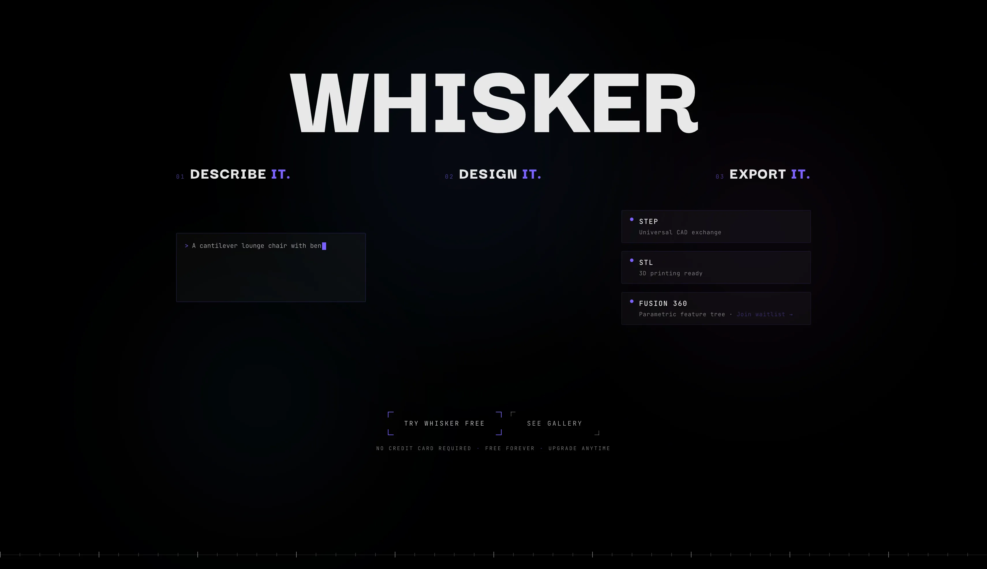 Generate production-ready parametric CAD models from natural language. Export to STEP, STL, and Fusion 360 with full feature trees. Free to start.