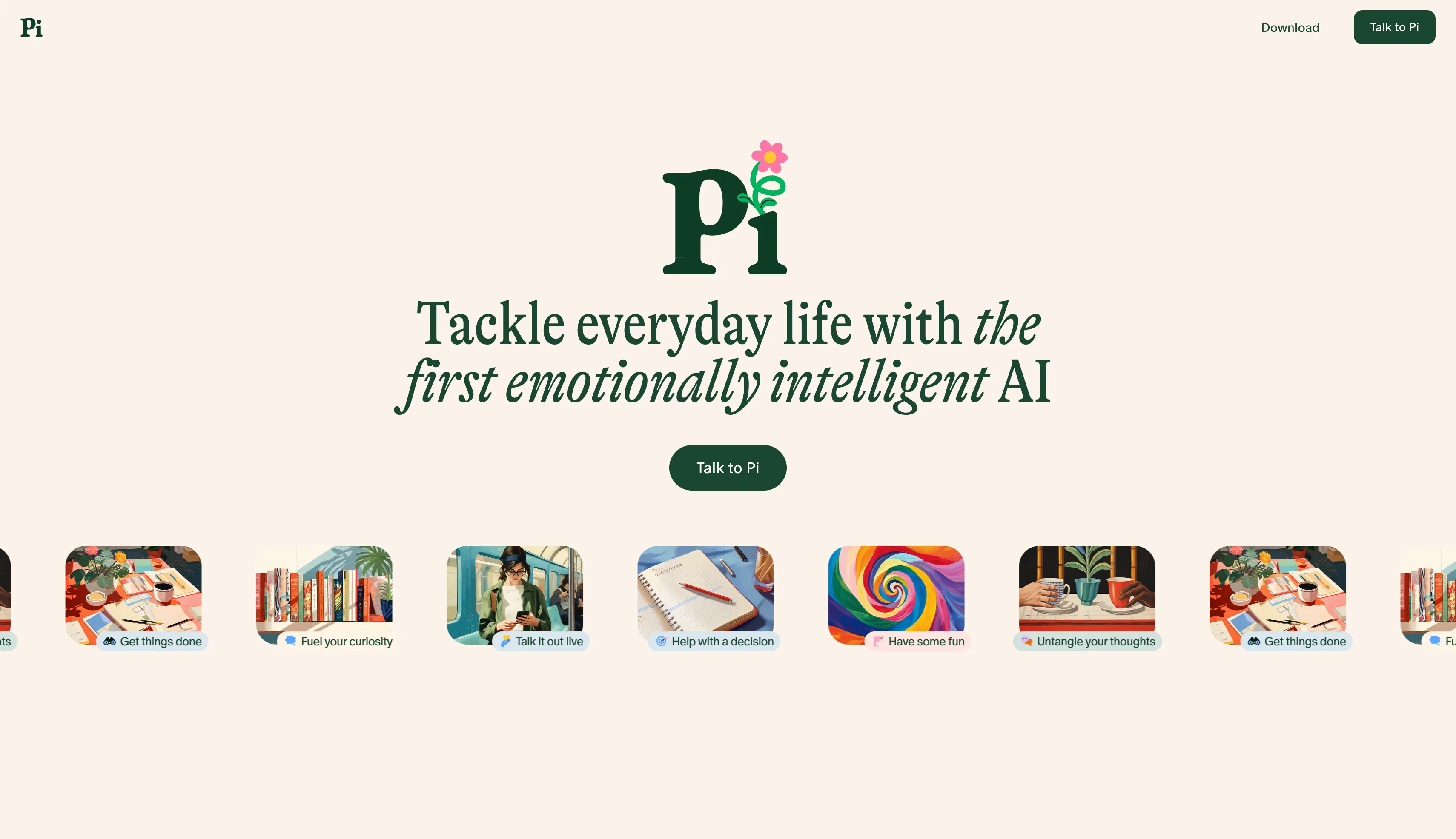 Ask Pi anything. Talk about everything. Pi is always curious, kind and ready to help you think, plan and grow. Talk to Pi, your personal AI.