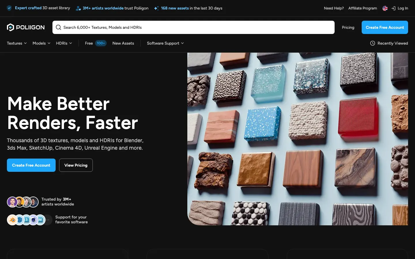 Thousands of PBR Textures, Models and HDRIs for Blender, 3ds Max, SketchUp, Cinema 4D, Unreal Engine and more.