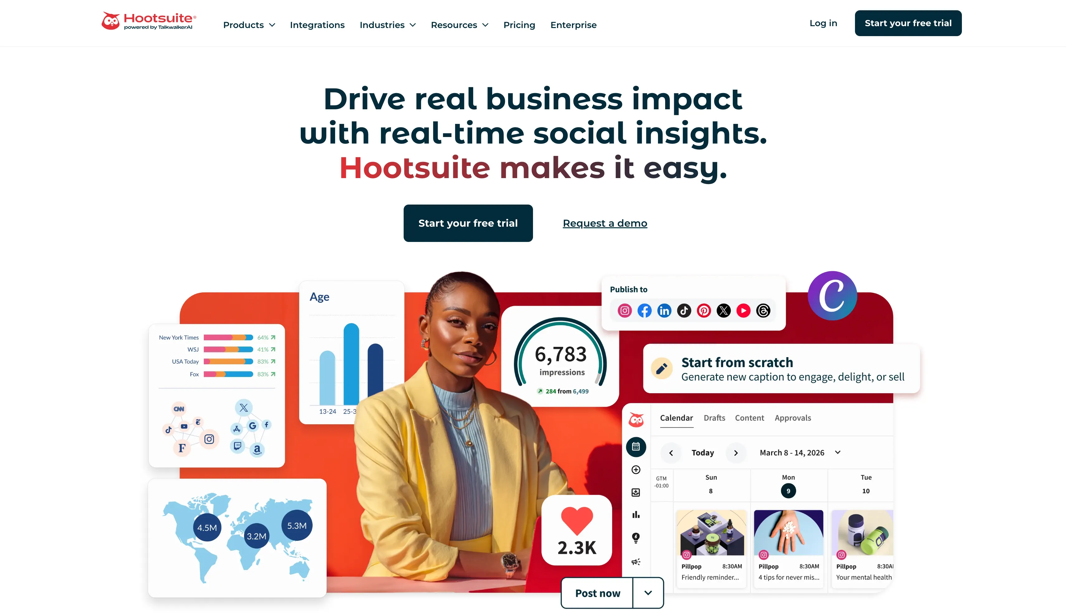 Hootsuite is a social media management tool that brings scheduling, content creation, analytics, and social listening to one place.