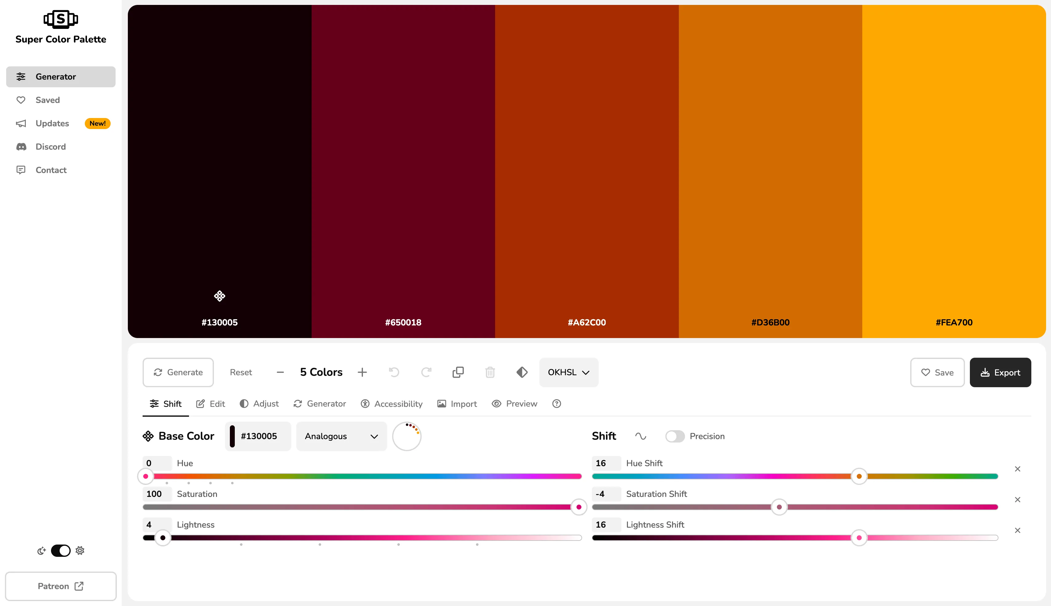 Generate super awesome color palettes by shifting hue, saturation, lightness, and more. 100% free without ads.