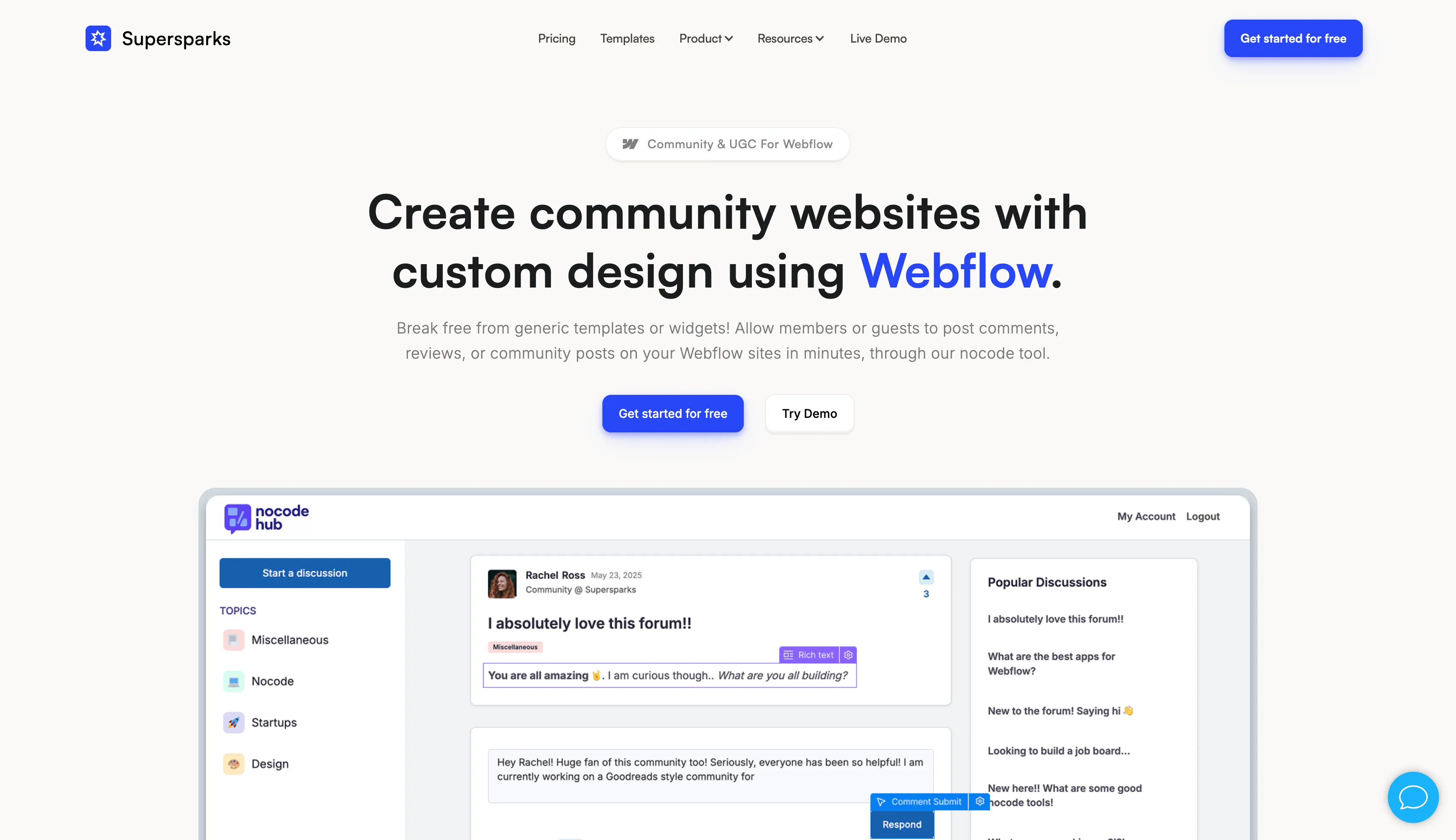 Add user generated content, such as comments, reviews, & community posts to your Webflow sites in minutes. 100% no-code & fully customizable in the Webflow Designer.