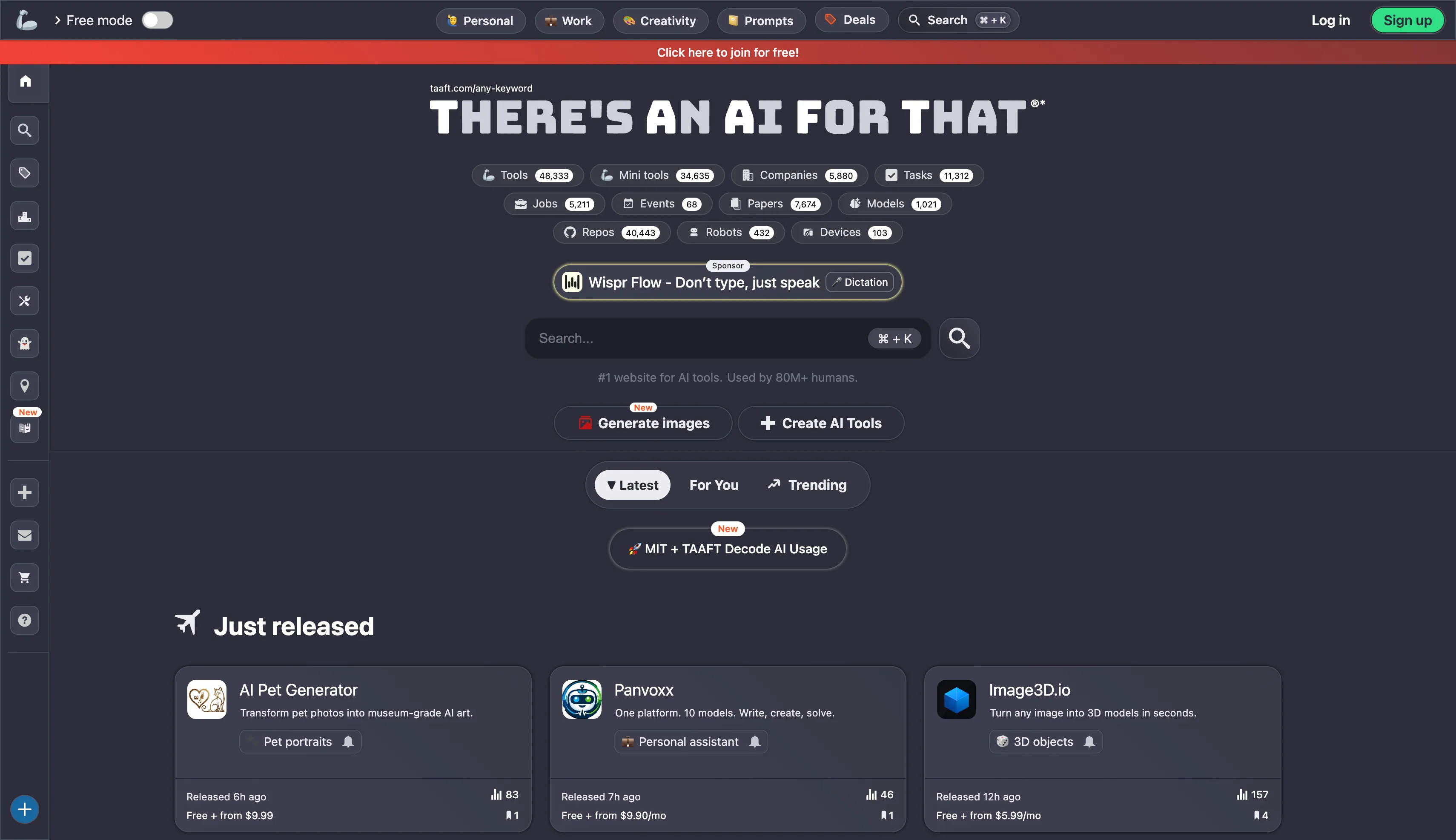 The #1 website for AI tools. Used by 80 million people to find the right tool for any task or use case.