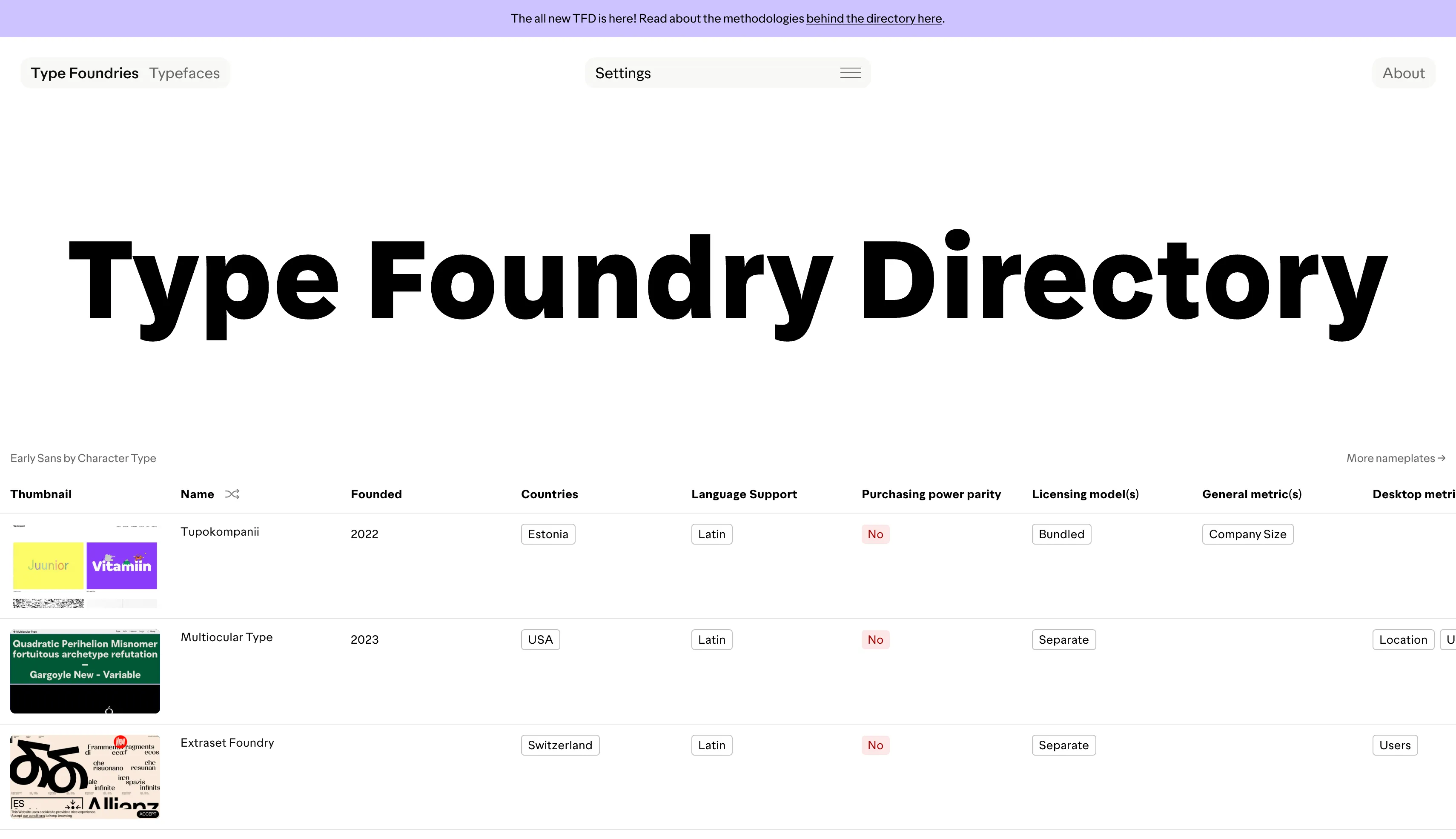 The Type Foundry Directory is a curated index of type foundries. Discover new fonts and support independent type foundries.