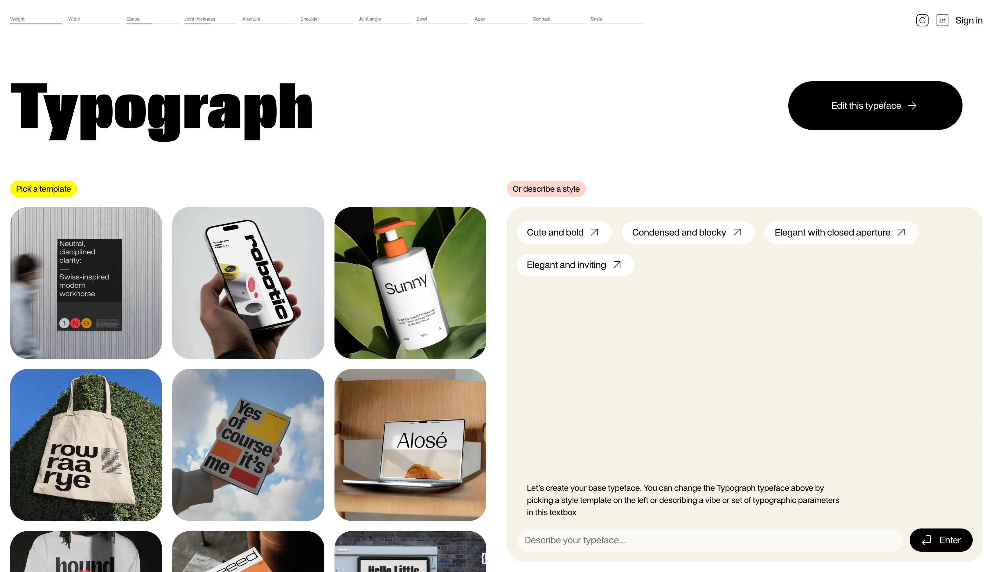 Typograph is a typography studio that offers various typeface styles and templates, allowing users to create custom base typefaces by selecting from numerous options or describing specific typographic parameters.