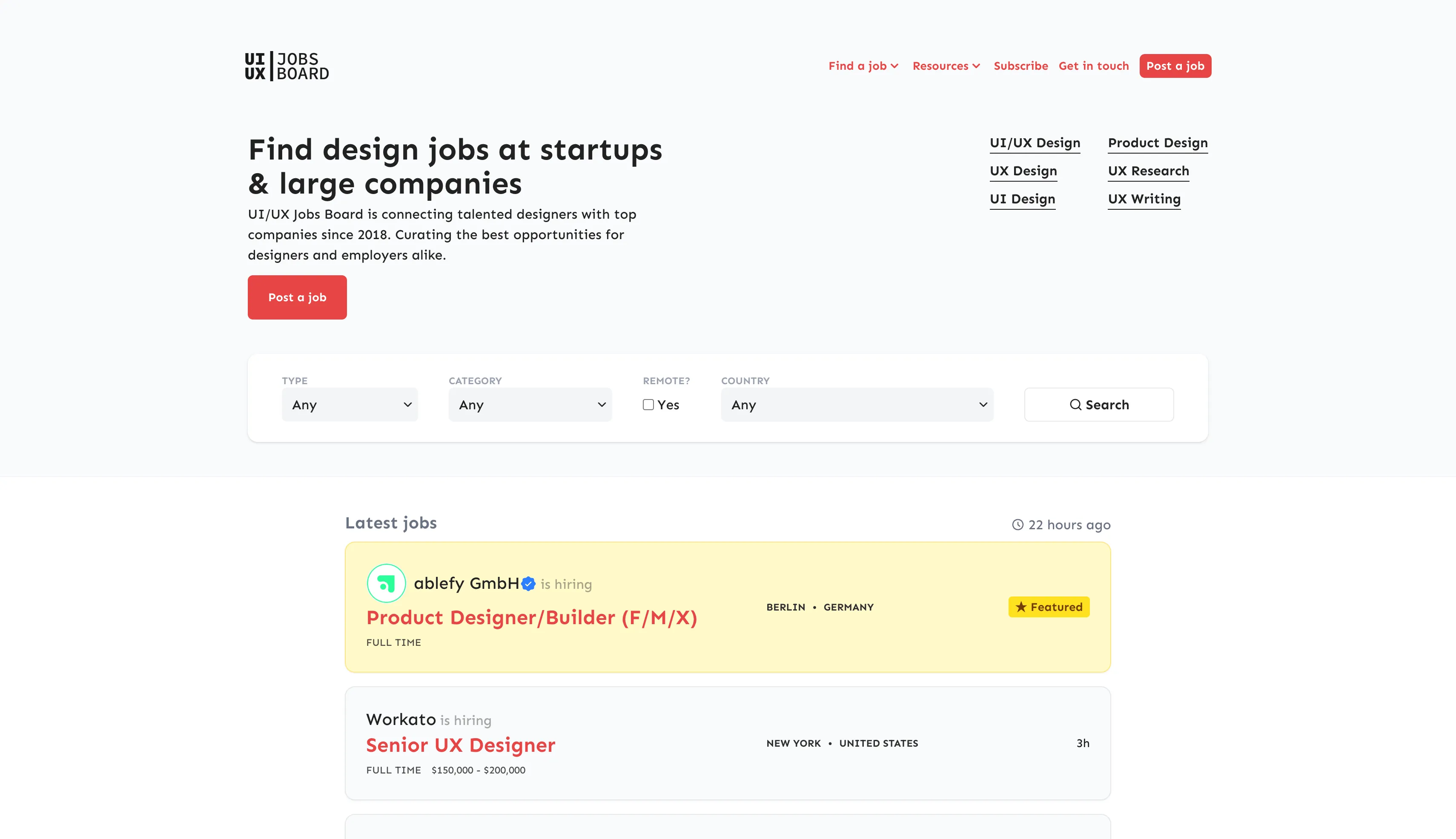 Browse our daily updated job board and find great UI/UX design jobs, product design jobs and UX researcher jobs at startups and large companies.