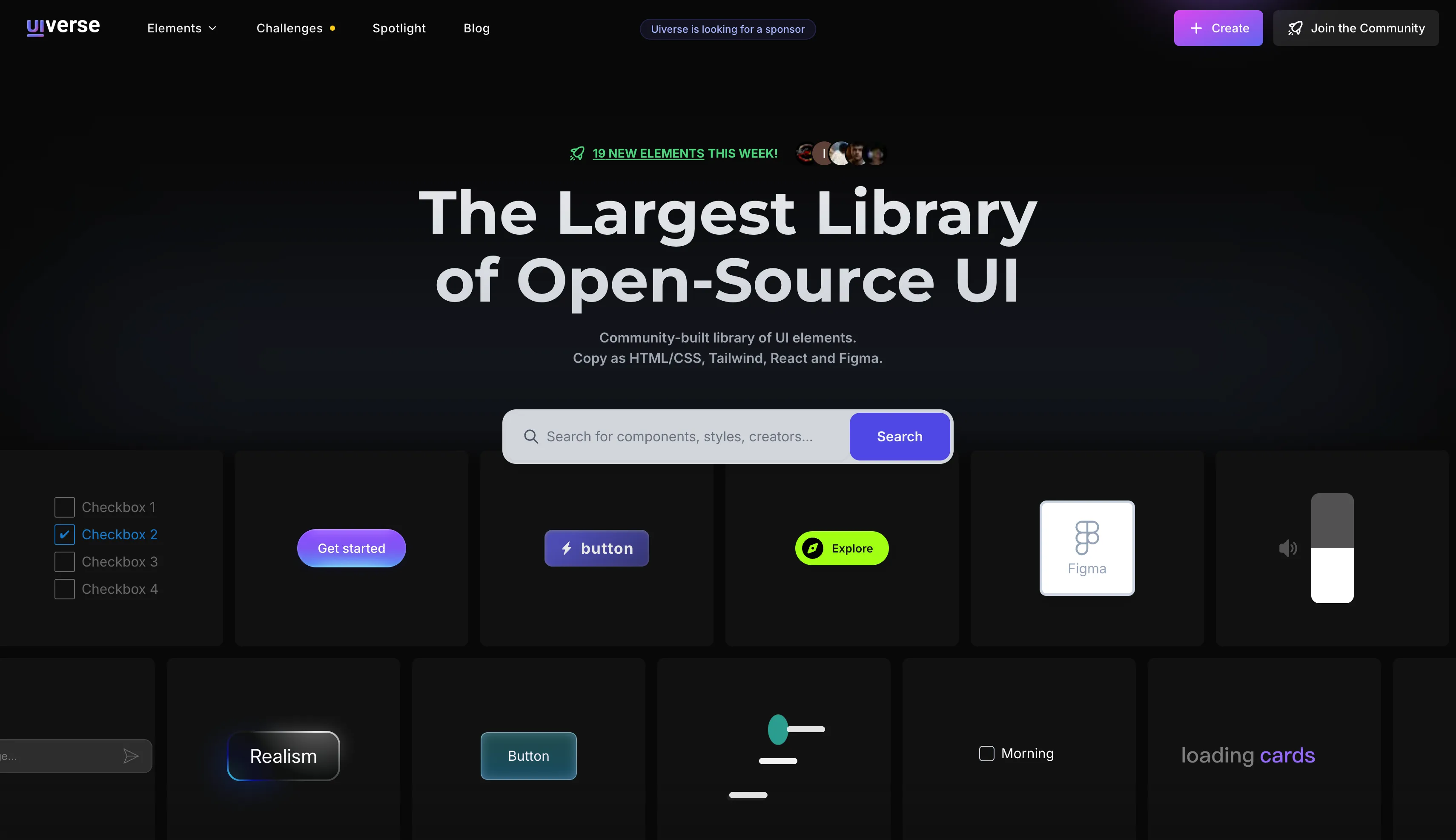 Community-made library of free and customizable UI elements made with CSS or Tailwind. It's all free to copy and use in your projects. Uiverse can save you many hours spent on building & customizing UI components for your next project.
