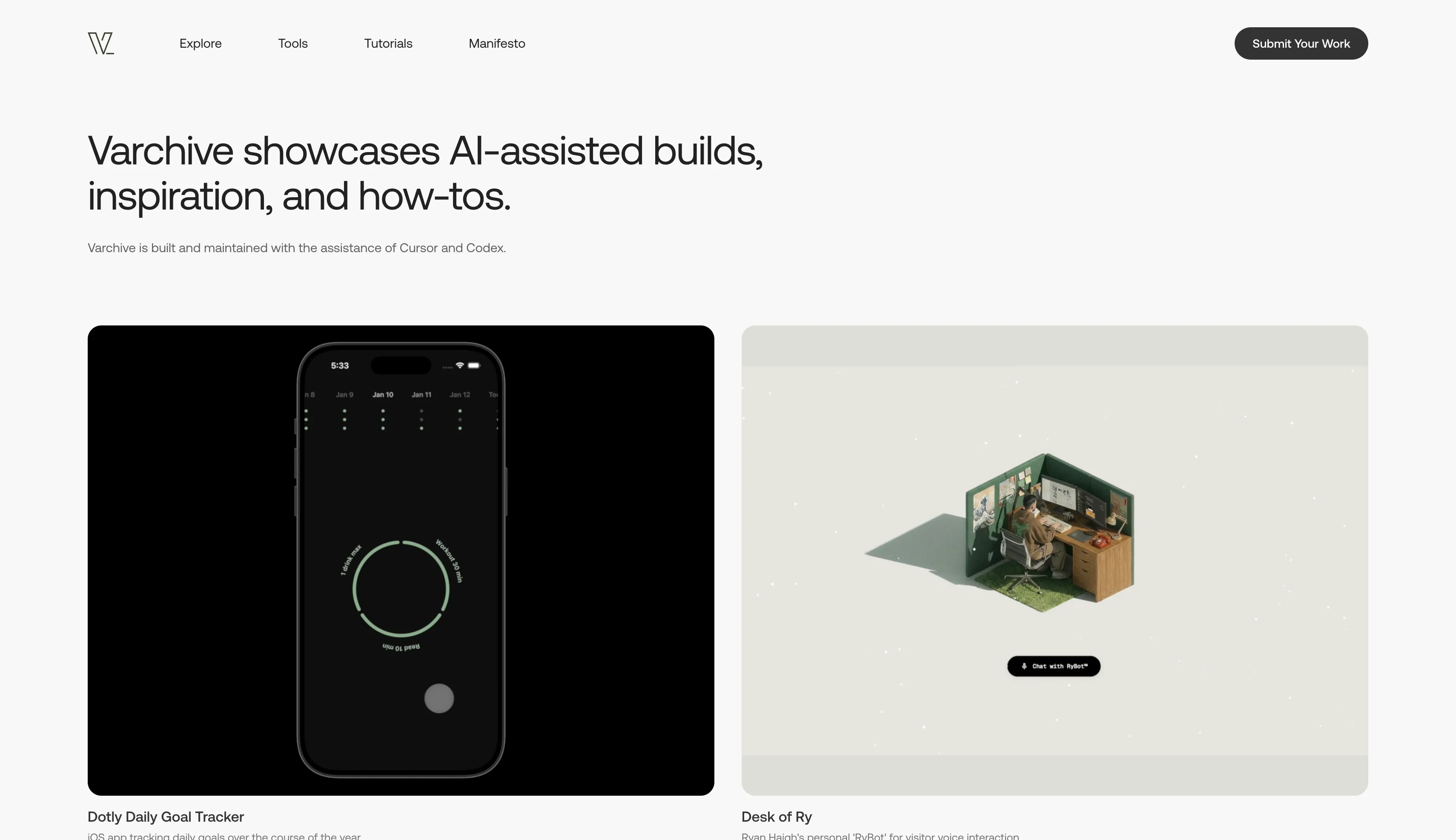 Varchive is a showcase of AI-assisted builds, inspiration, and how-tos. Itself assisted by AI.