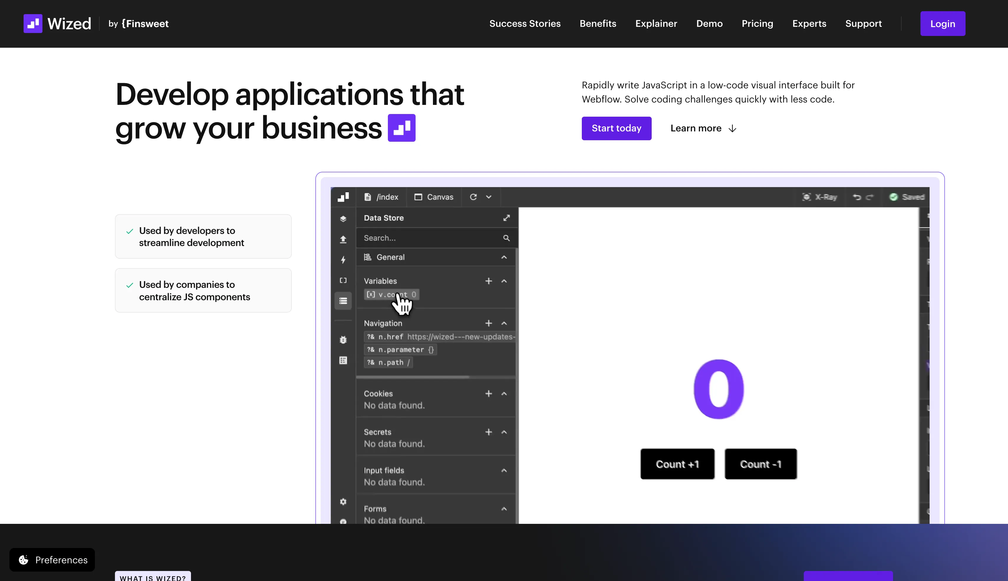 Develop web applications in Webflow with no-code. Work with APIs, third-party applications, and user accounts. Integrate apps in Webflow with Wized.