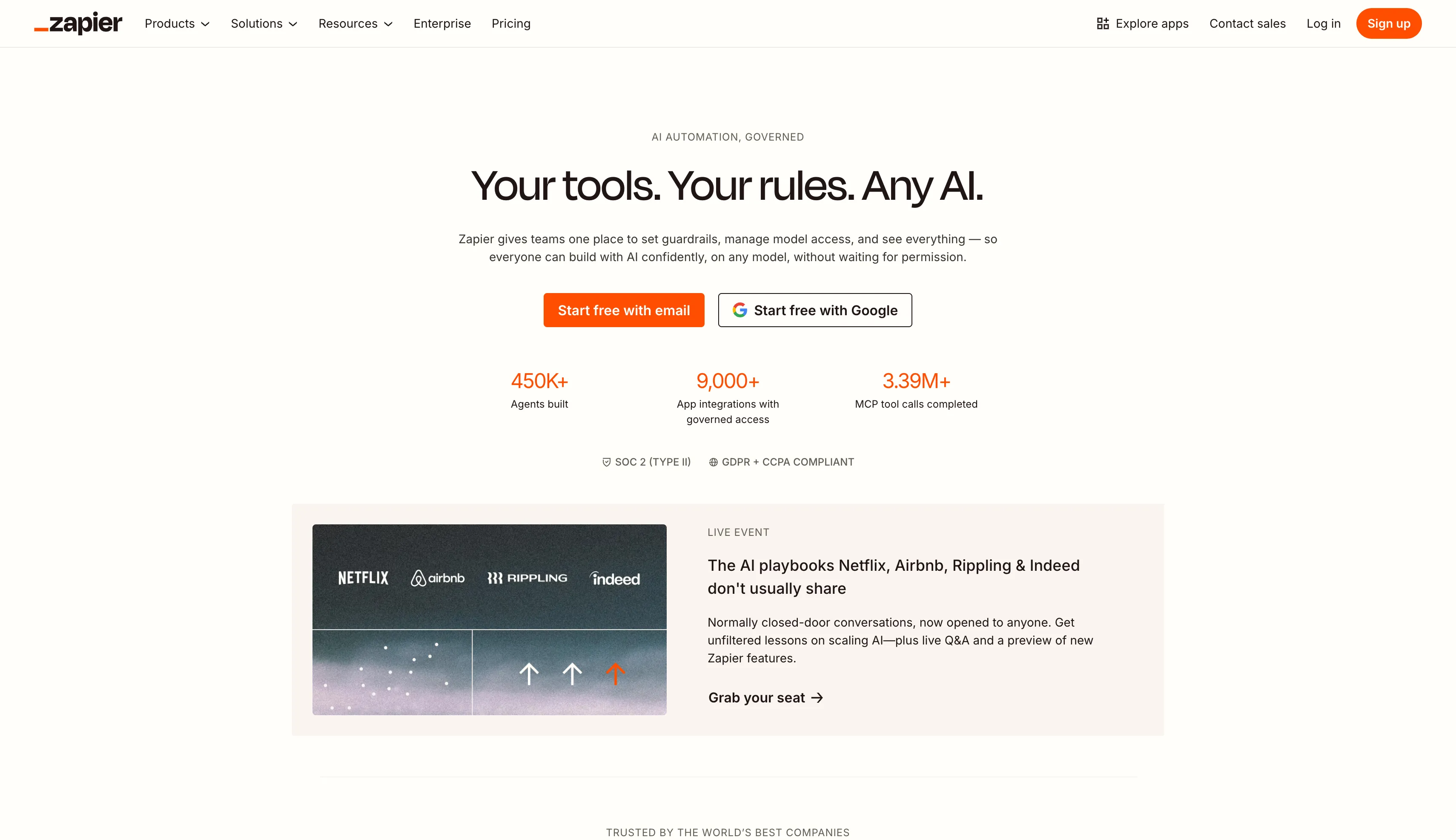 Build and scale AI workflows and agents across 8,000+ apps with Zapier—the most connected AI orchestration platform. Trusted by 3 million+ businesses.